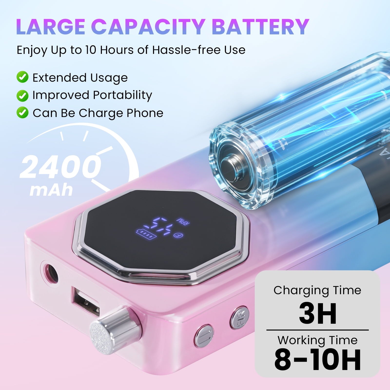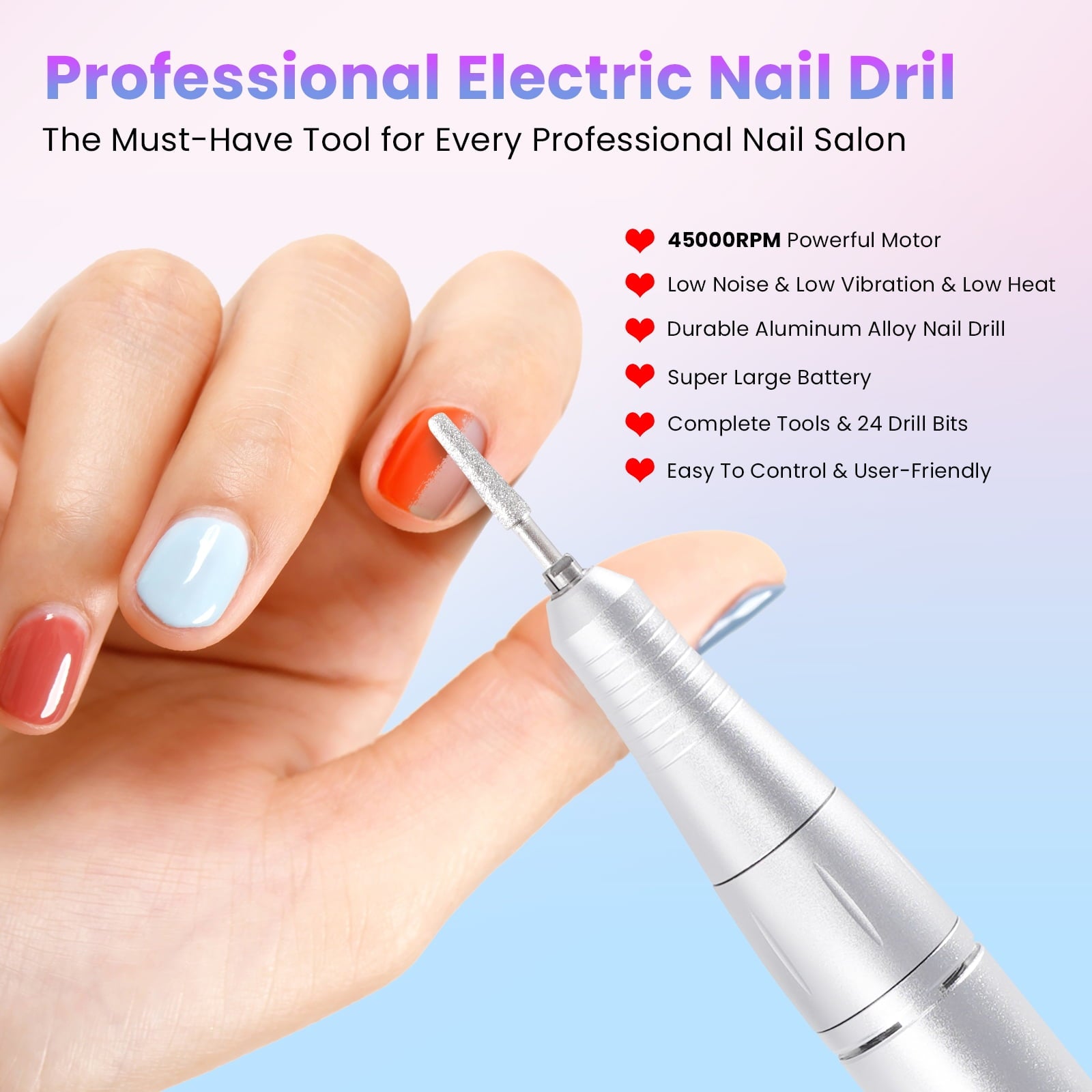 Professional Nail Drill Kit 45000 RPM, Rechargeable Electric Nail File , Cordless E-File Machine with LCD Display & 24 Drill Bits for Acrylic, Gel Nails & Cuticle Care